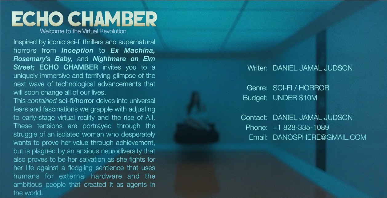 ECHO CHAMBER (former known as THE KEEPER) Horror/Sci-Fi feature screenplay is the of Winner the Filmmatic Sci-Fi & Fantasy Award 2025, Winner of WeScreenplay Diverse Voices Lab 2025; Finalist in ScreenCraft Sci-fi/Fantasy, Top 5 Finalists in ScreamFest Horror awards, and scored 9/10 on BlackList evaluation.